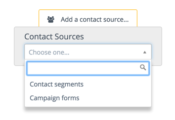 The first thing to be selected is where the campaign will pull in contacts from or contact sources. There are currently two options for contact sources: segments and forms. One or both can be added to the campaign.