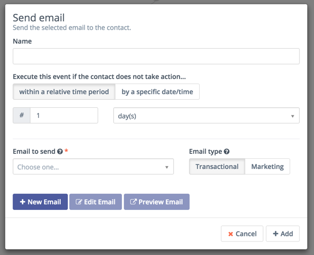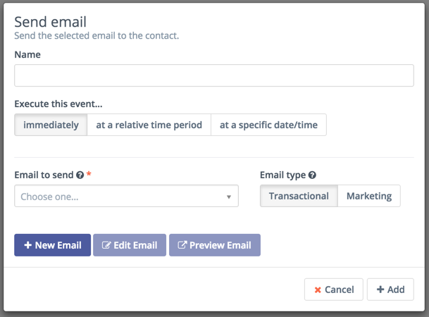When you create a campaign you will select one of these actions to begin the workflow. In most cases this initial step will be an email sent to your segments.